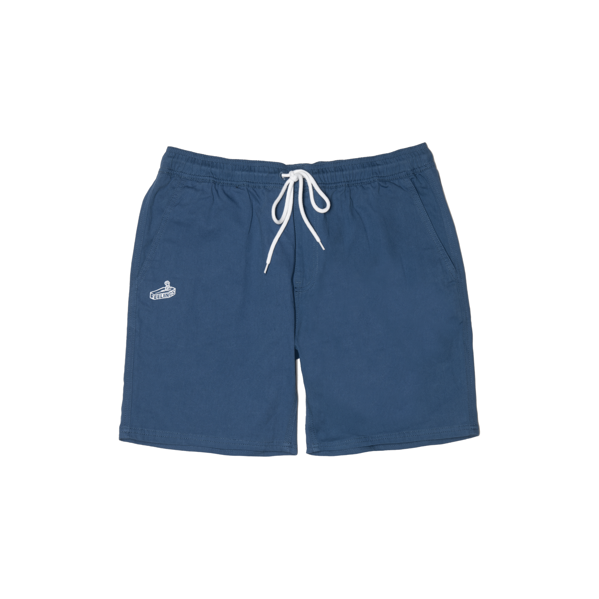 Color azul marino verdadero Forma relajada Cintura elástica Sarga resistente 2 bolsillos delanteros 1 bolsillo trasero en el lado derecho Cordón redondo en la cintura. Parche tejido Feelings en el bolsillo trasero Bordado de arte de ataúd en el bolsillo delantero derecho.